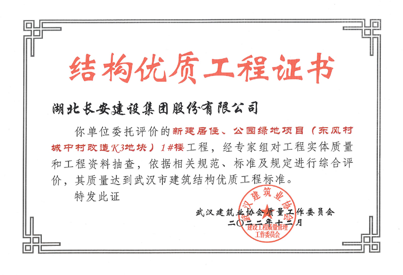 東風(fēng)村城中村改造k3地塊1#、2#、4#樓獲評“武漢市建筑結(jié)構(gòu)優(yōu)質(zhì)工程”