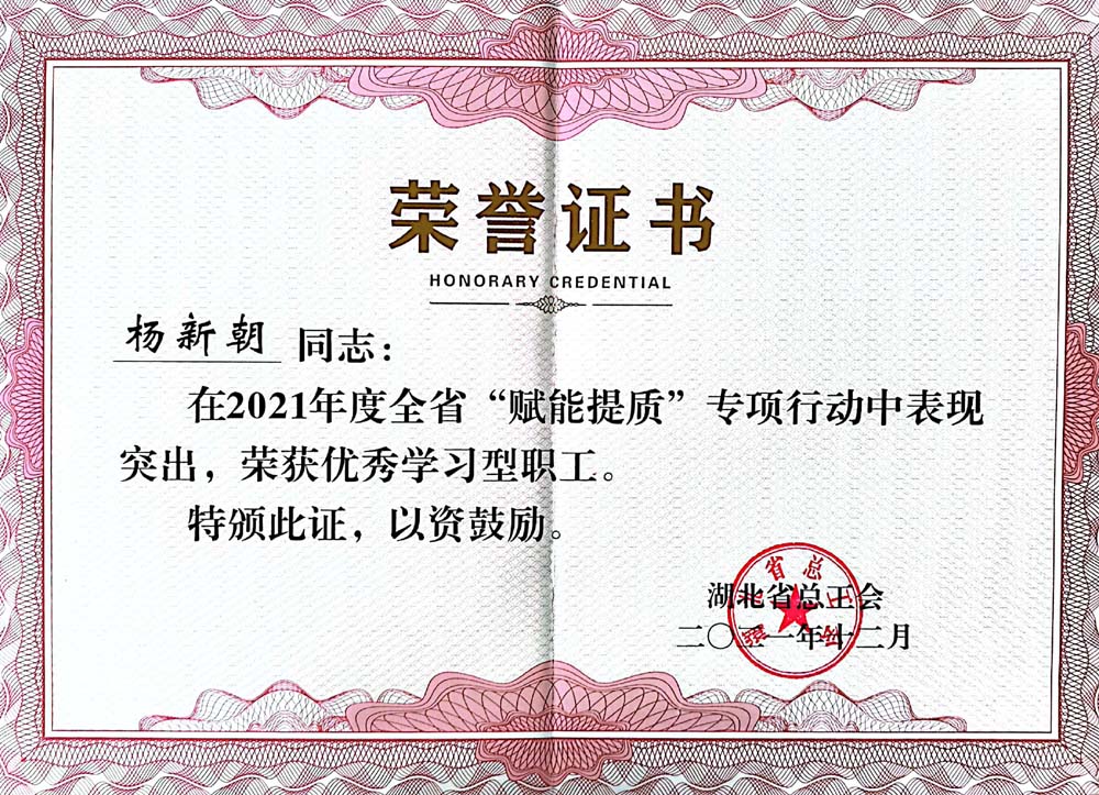 楊新朝榮獲2021年度湖北省賦能提質優秀學習型職工稱號