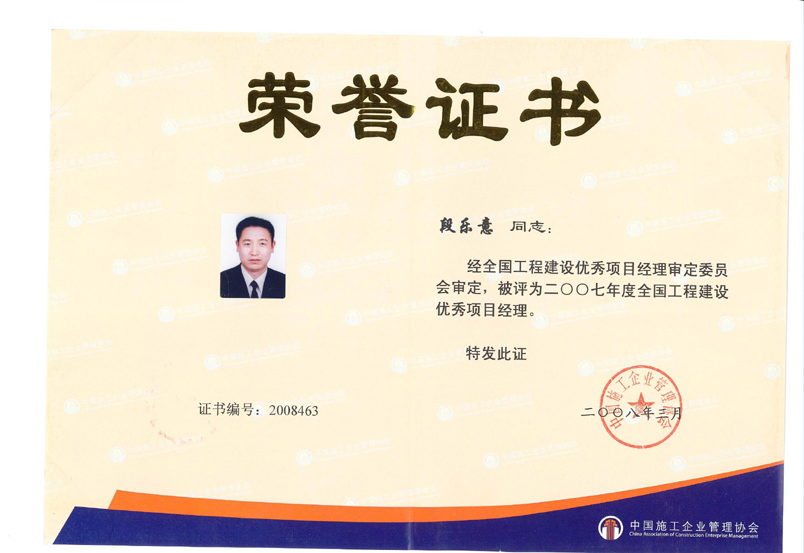 2007年度全國建筑業企業優秀項目經理(蔣同義)