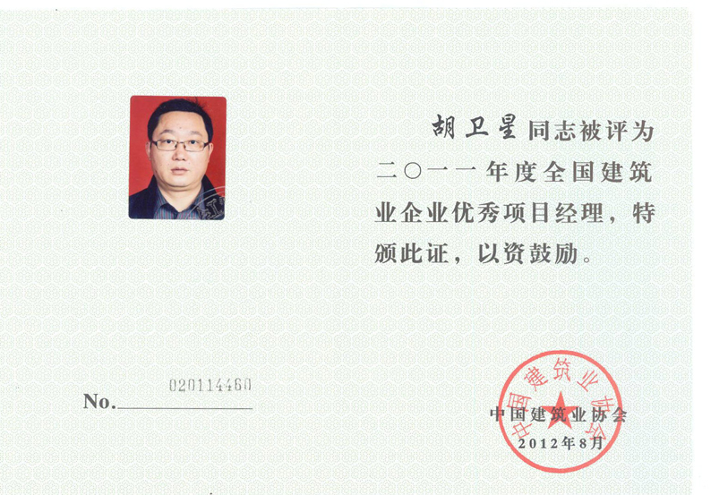 2011年度全國建筑業企業優秀項目經理(胡衛星)