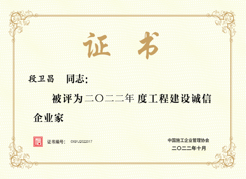 集團董事長段衛昌榮獲二O二二年度工程建設誠信企業家稱號