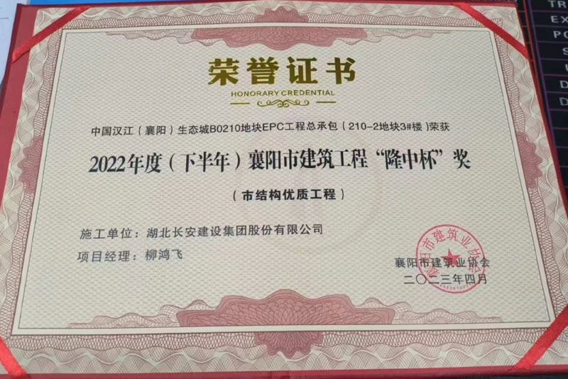 襄陽生態城B0210地塊(210-2地塊3#樓)榮獲“隆中杯”獎(市結構優質工程)