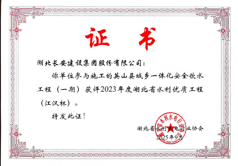 英山縣城鄉一體化安全飲水工程(一期)獲評2023年度湖北省水利優質工程(江漢杯)