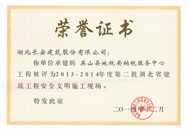 英山縣地稅局納稅服務中心被評為2013-2014年度省建筑工程安全文明施工現場