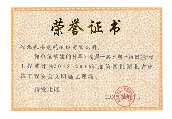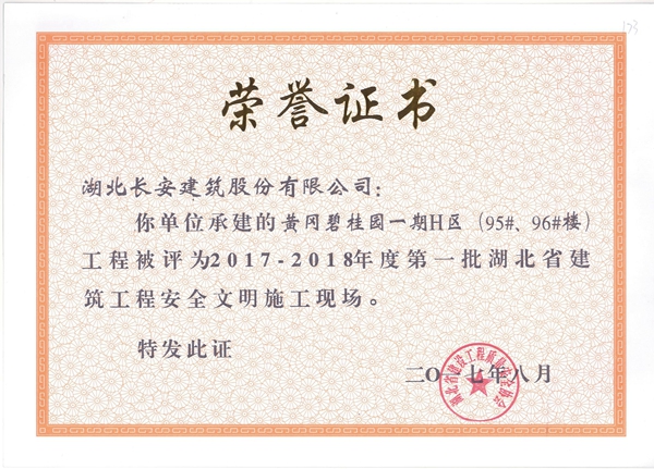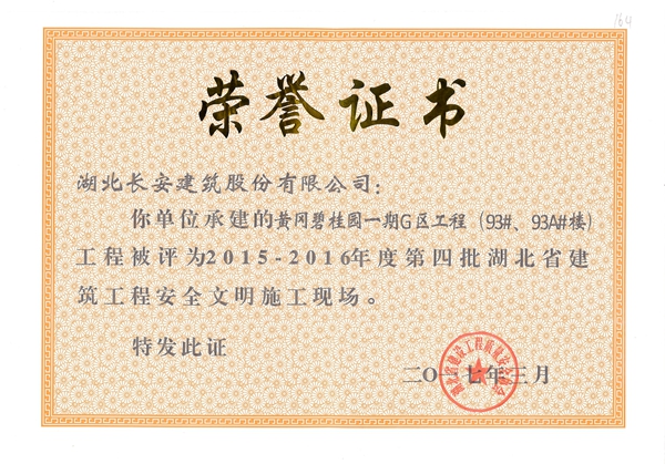 黃岡碧桂園一期G區(93#、93A#樓)被評為2015-2016年度第四批省安全文明施工現場([2017}7號)