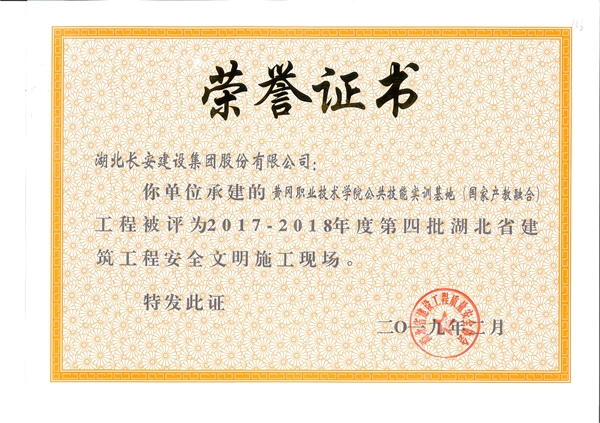 黃岡職業(yè)技術學院公共技能實訓基地(國家產融合)工程被評為2017-2018年度第四批省安全文明施工現場