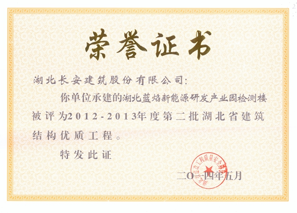 湖北藍焰新能源研發產業園檢測樓2012-2013年度省建筑結構優質工程