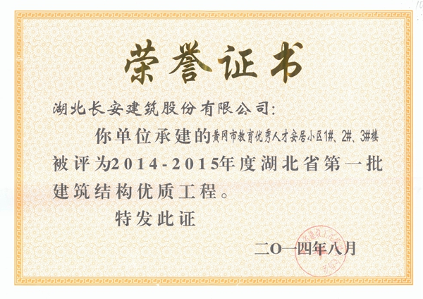 黃岡市教育優秀人才安居小區1、2、3#樓被評為2014-2015年度省建筑結構優質工程