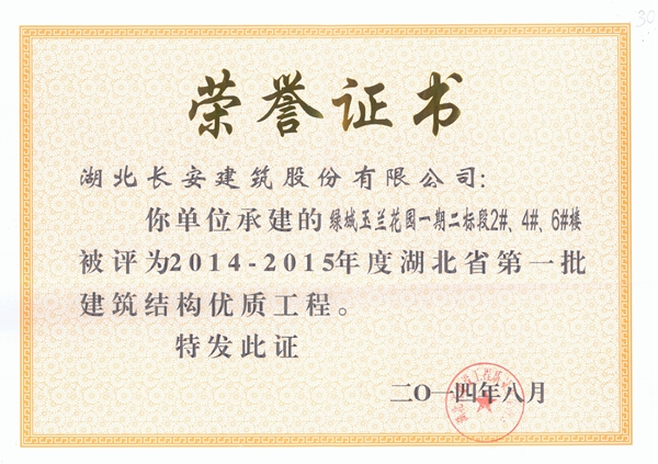 綠城玉蘭花園一期二標段2、4、6#樓被評為2014-2015年度省建筑結構優質工程