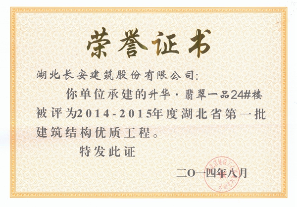 升華翡翠一品24#樓被評為2014-2015年度省建筑結構優質工程