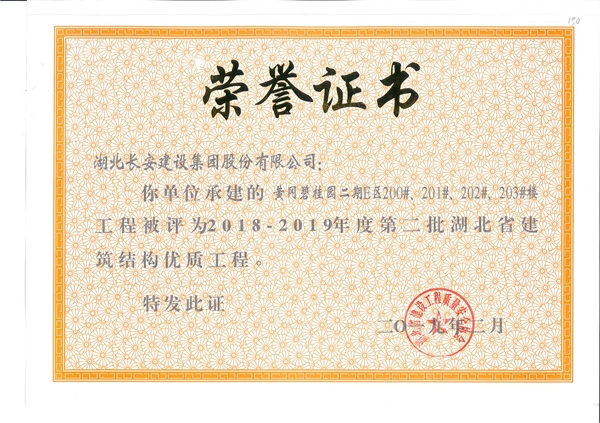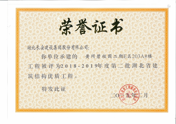 黃岡碧桂園二期E區(qū)203A#樓工程被評為2018-2019年度第二批省結構優(yōu)質(zhì)工程