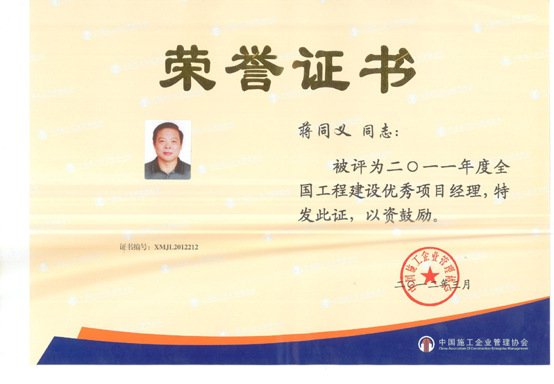 2011年度全國工程建設優秀項目經理(蔣同義)