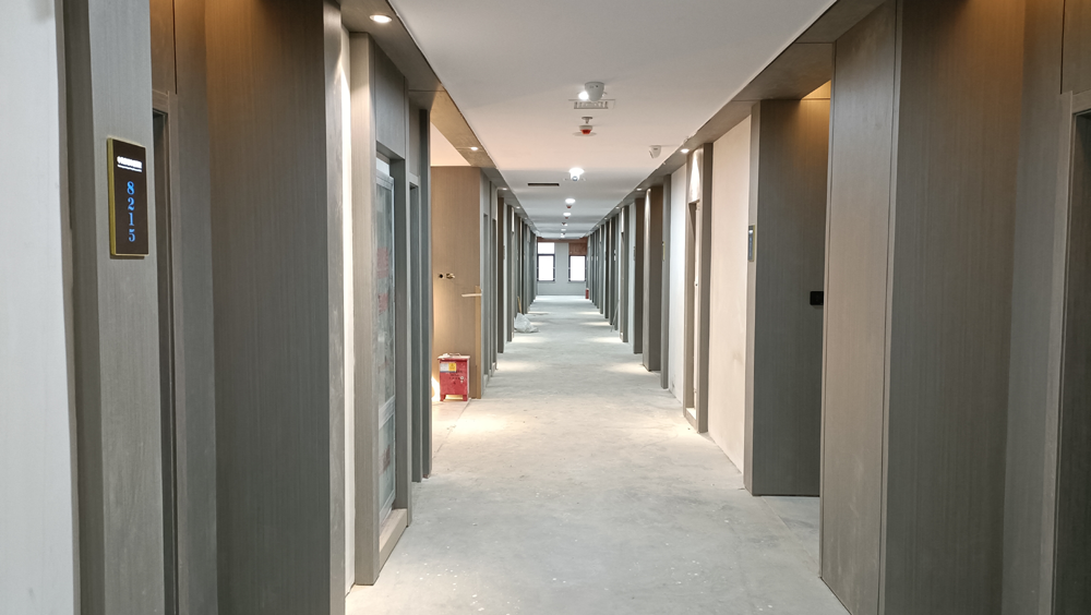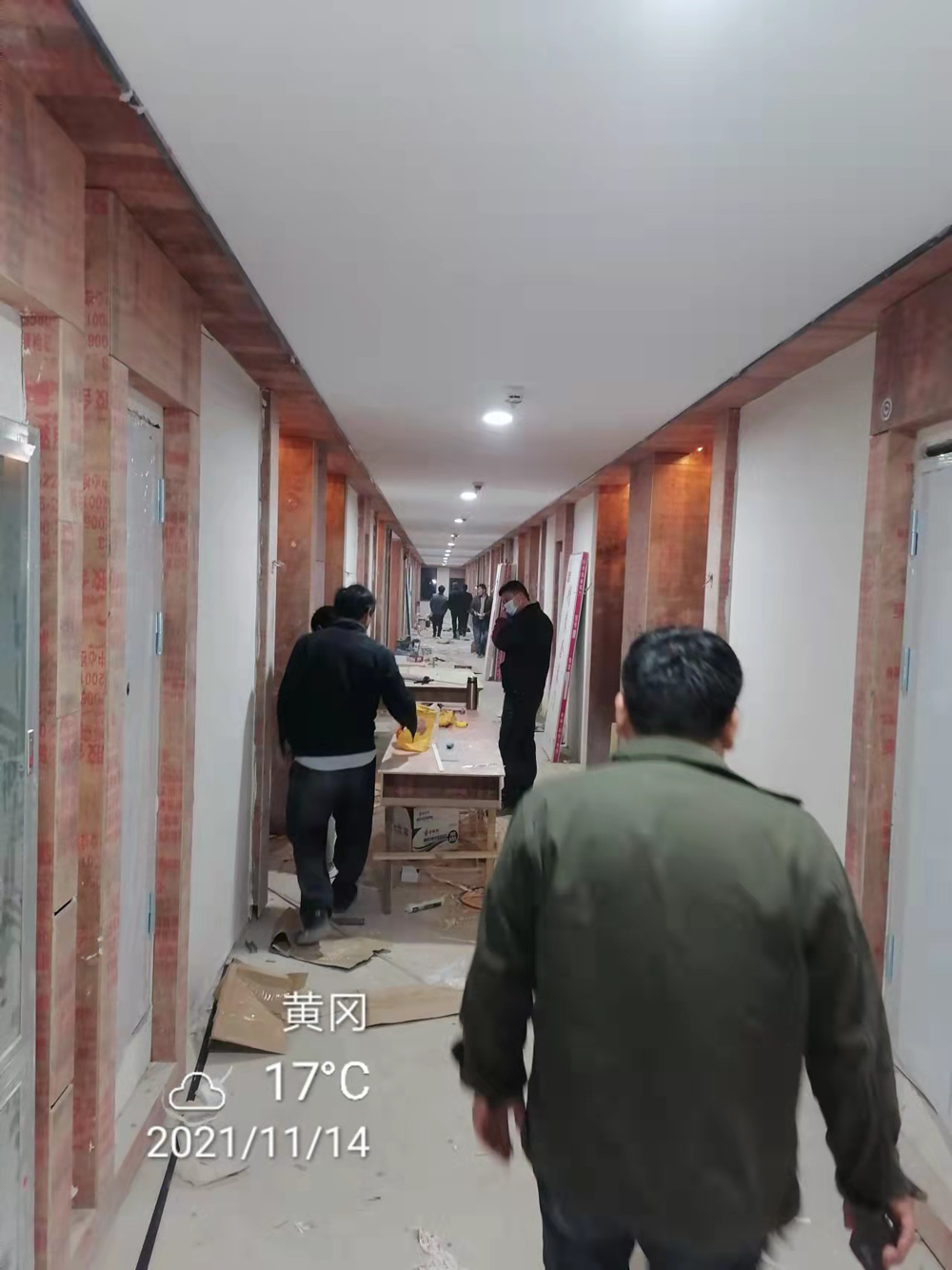 該隔離點(diǎn)搶建工程共計(jì)6層,總建筑面積6600m2,而且時間緊、任務(wù)重、裝修檔次較高。設(shè)計(jì)內(nèi)墻涂料、木飾面板、墻布、軟包、壁畫、硬包、不銹鋼線條、木門、防火門、復(fù)合地板、人造石、淋浴房、開關(guān)、燈具、潔具、消防、電視、監(jiān)控等,點(diǎn)多面廣,綜合管理難度較大。項(xiàng)目各班組采取晝夜連續(xù)施工的方式,加緊建設(shè)。長安建設(shè)集團(tuán)積極整合資源,組織200余名精干職工從早晨6;00--晚上23:00不間斷施工,確保原約定2個月完成的施工任務(wù)在短短的10天內(nèi)保質(zhì)保量完成。