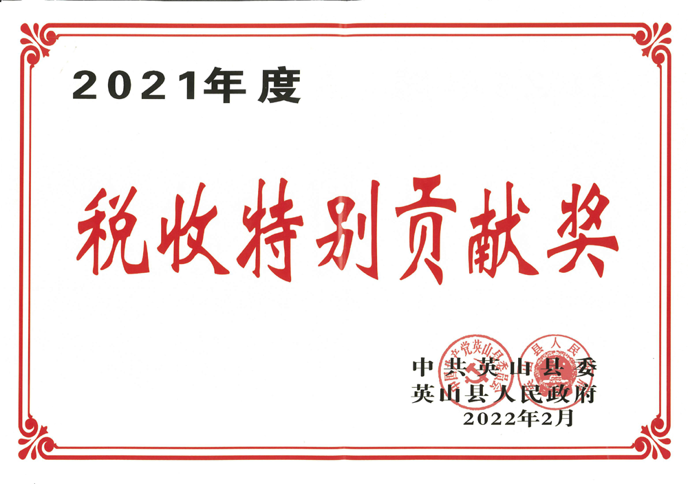 2月9日,中共英山縣委、英山縣人民政府授予集團“2021年度稅收特別貢獻獎”,集團連續10年穩居“英山縣第一納稅大戶”榜首。
