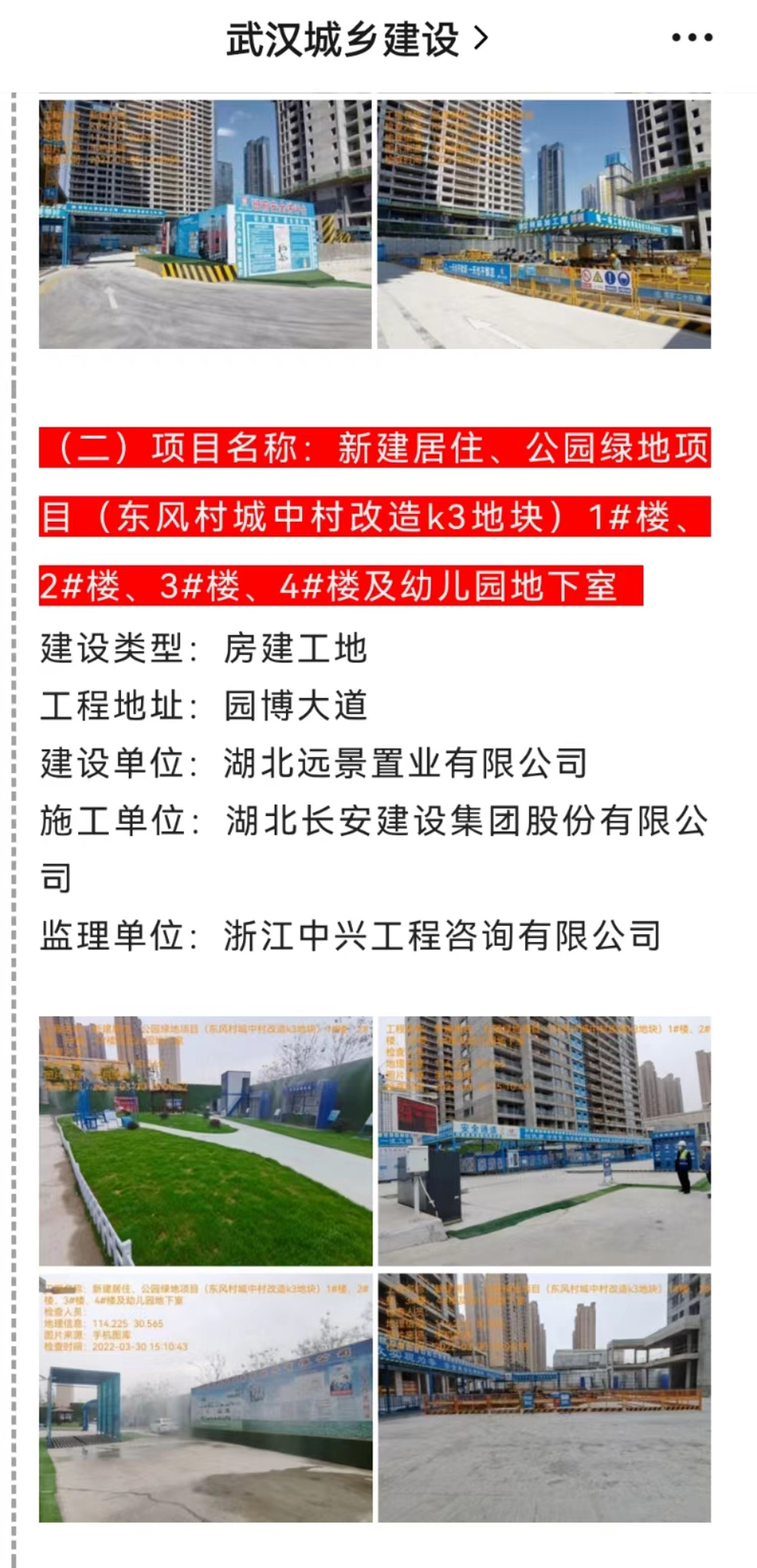 此前的3月29日,湖北省綠色建造科技創新聯合體觀摩交流會在K3項目召開。最近,在武漢市城鄉建設專班巡查整頓活動中,認定K3項目為“文明施工較好工地”,得到通報表揚。在2021年,H5地塊項目被評為武漢市10月份文明施工流動紅旗建設工地。