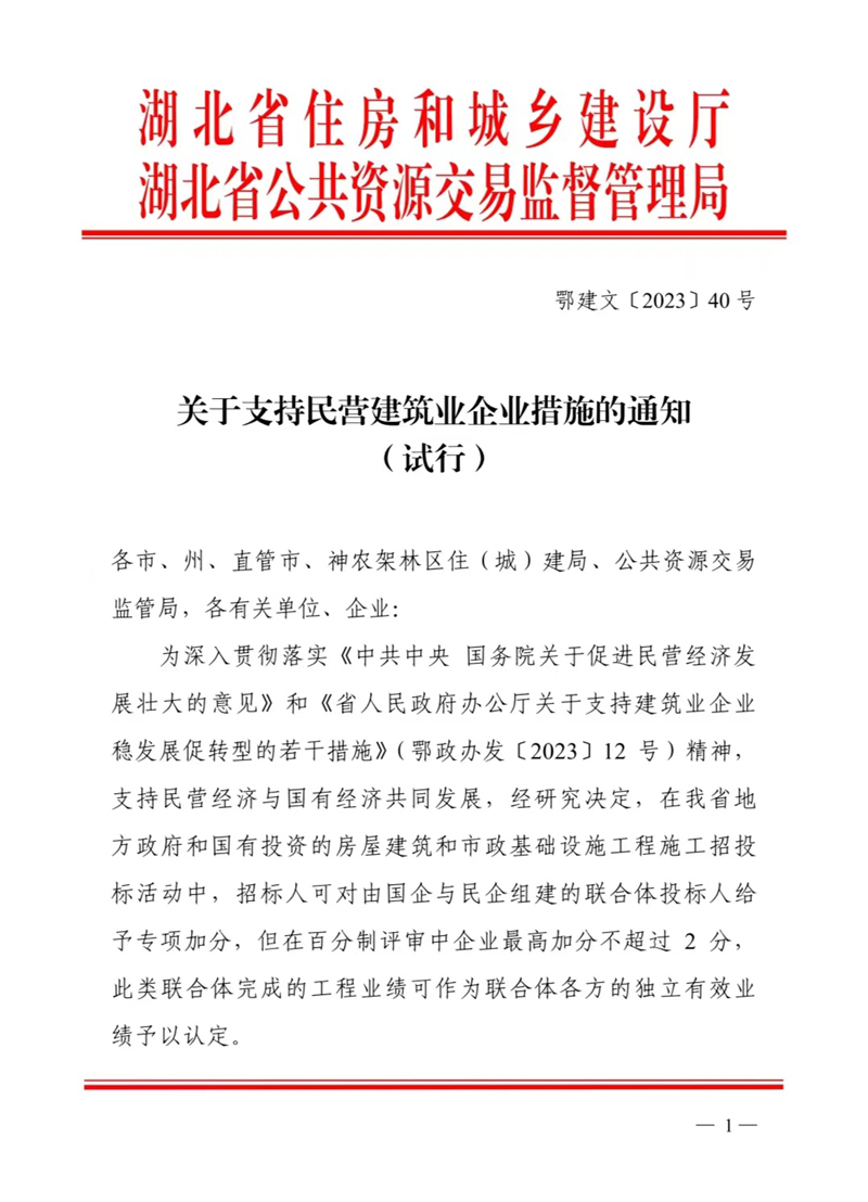 湖北省住房和城鄉建設廳、湖北省公共資源交易監督管理局 關于支持民營建筑業企業措施的通知(試行)