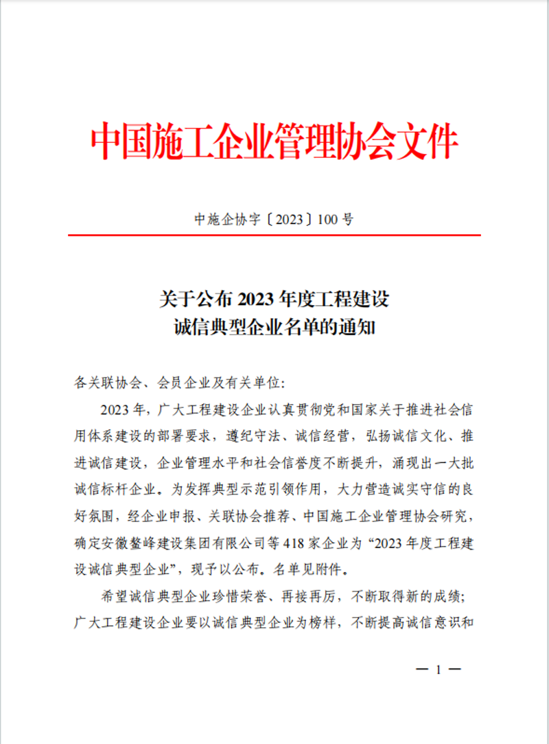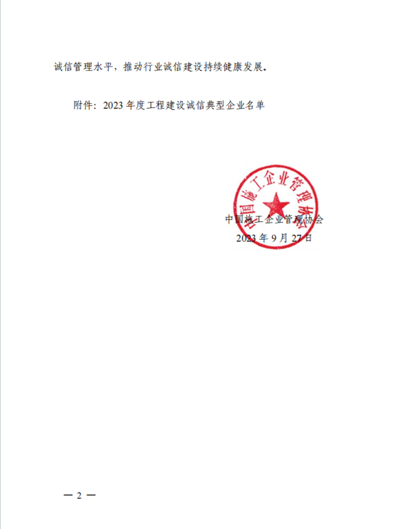 9月27日,中國施工企業管理協會公布“2023年度工程建設誠信典型企業名單”,集團公司榜上有名。這是集團公司連續三年/次獲此殊榮。