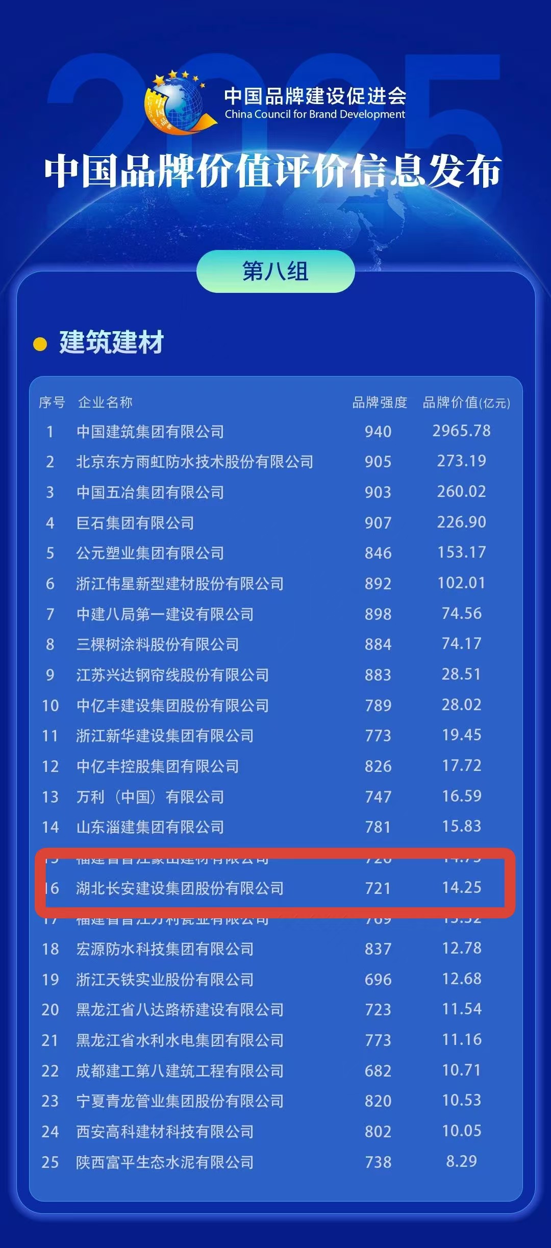 5月10日,在浙江省德清縣召開的2025世界品牌莫干山大會上,中國品牌建設(shè)促進(jìn)會、中國資產(chǎn)評估協(xié)會、新華社等單位聯(lián)合對“2025中國品牌價(jià)值評價(jià)信息”開展權(quán)威發(fā)布。英山縣本土企業(yè)品牌、“湖北長安建設(shè)集團(tuán)股份有限公司”入圍建筑建材組榜單第16位,其品牌強(qiáng)度為721,品牌價(jià)值14.25億元,較上一年度增長1.04億元,再創(chuàng)歷史新高。