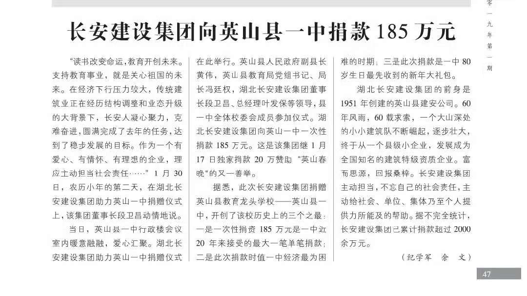 長安建設(shè)集團(tuán)向英山縣一中捐款185萬元