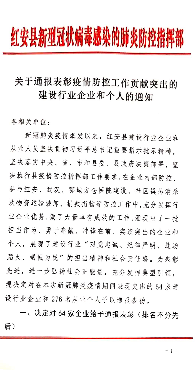 紅安縣疫情防控指揮部對集團(tuán)及個(gè)人予以表彰